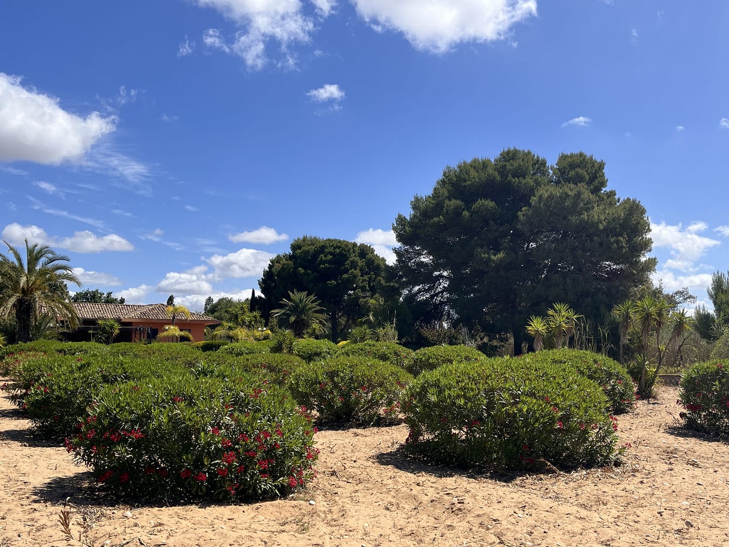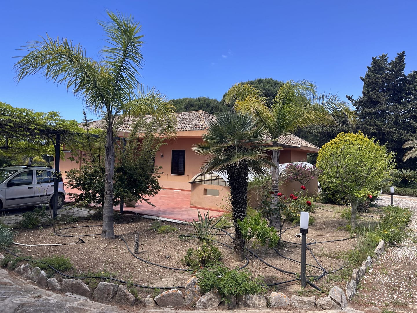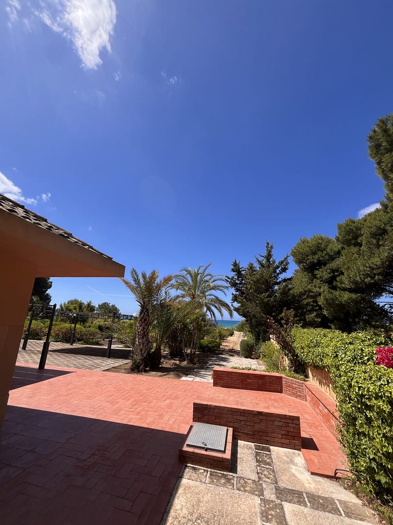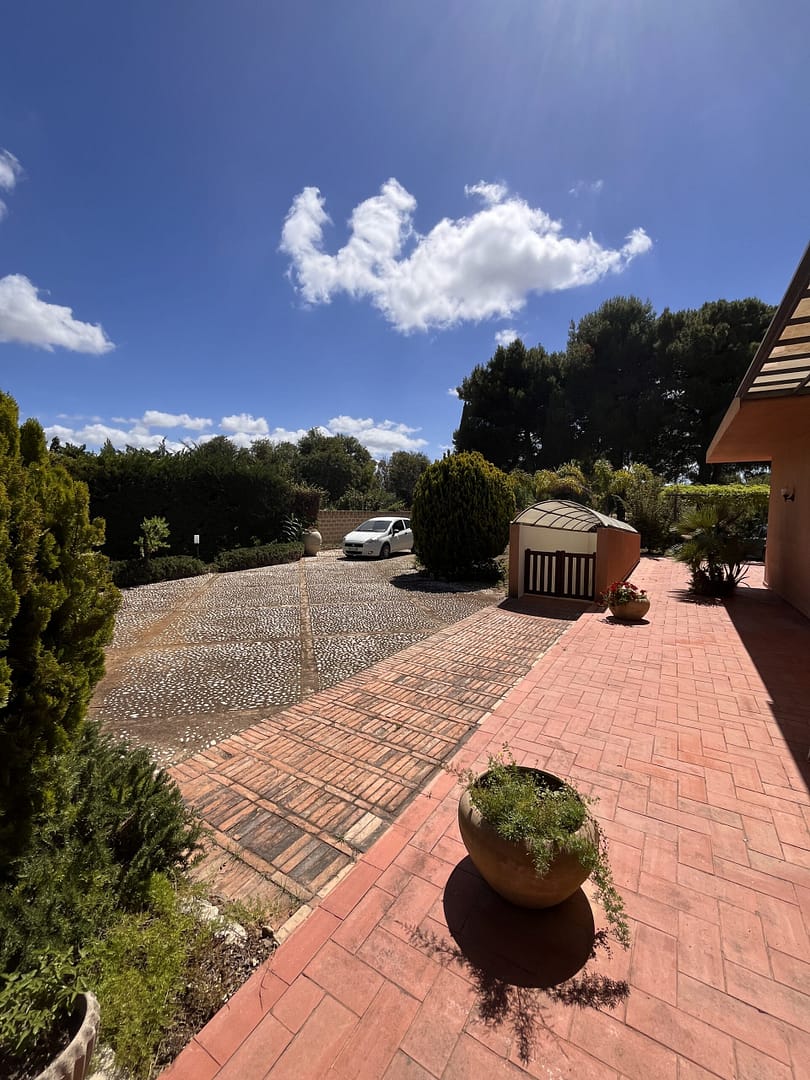 Erst kurz vor dem Strand biegen Sie ab auf einen Privatweg, über den Sie das imposante Anwesen erreichen. Das parkähnlich angelegte Grundstück empfängt Sie mit großzügig gepflasterten Wege- und Parkflächen . Sie sind umringt von einer Vielfalt mediterraner Blumen, Sträucher, Palmen und Bäumen. Sei es der „Phoenix Canariensis“, die Seekiefer, Palmfarn oder Oleander, viele haben sich bereits über mehrere Jahrzehnte entfaltet.