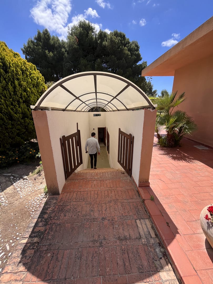 Vor der Villa führt eine breite und überdachte Außentreppe zu einer unterirdischen, als Lagerraum genutzten Räumlichkeit, mit einem daneben liegenden, kleinen Badezimmer. In der Decke des Lagerraums befindet sich ein Oberlicht für Tageslichteinfall. Der ca. 42 m² große Raum mit 2 Metern Deckenhöhe ist vollständig gefliest und vielseitig nutzbar.